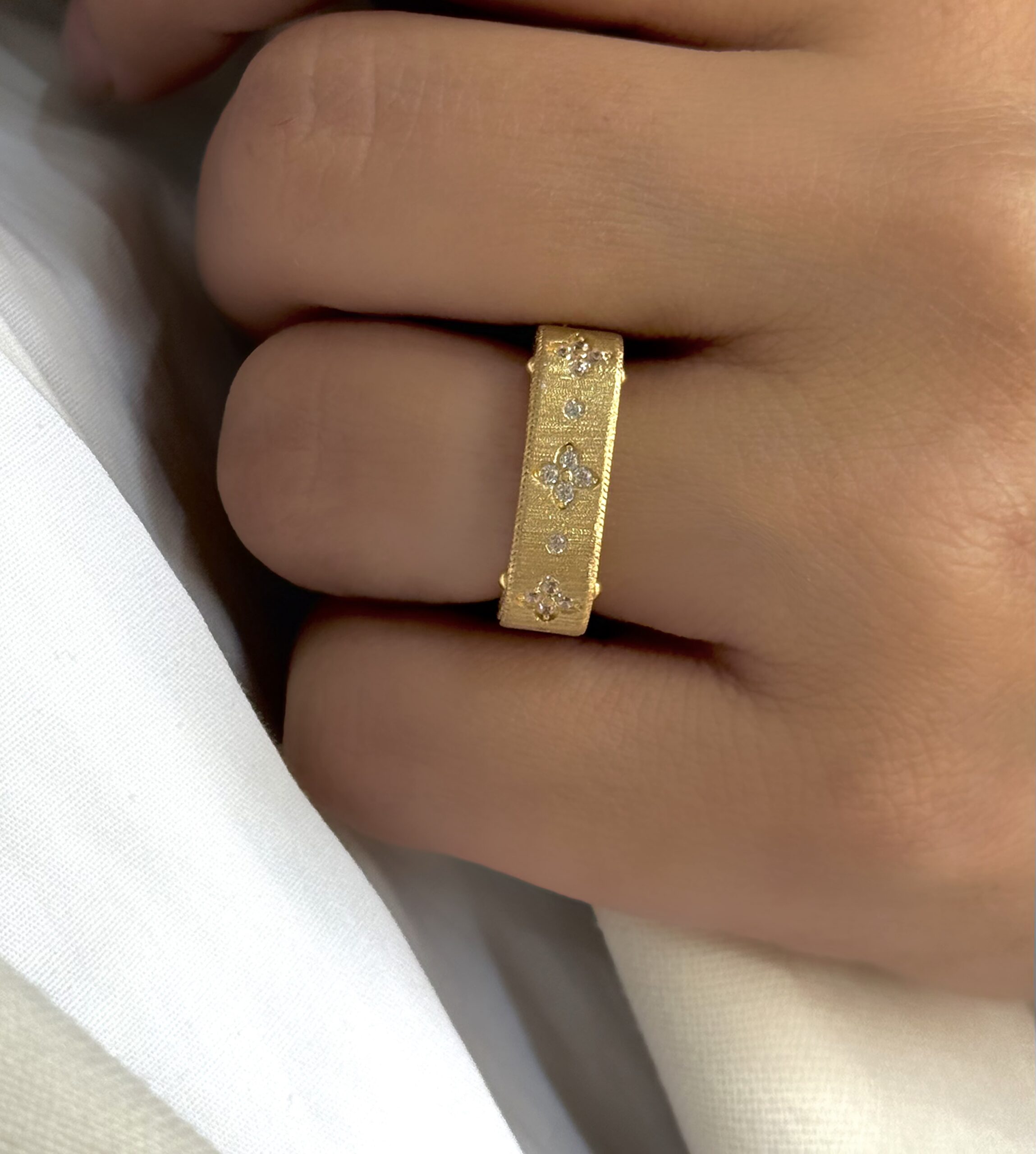 این حلقه طلای ظریف با طراحی کلاسیک و سطح مات، جلوهای لوکس و ماندگار ایجاد میکند. نگینهای ریز درخشان و نقشهای گلمانند روی بدنه، نمادی از شکوفایی و زیبایی ابدی هستند و استایلی خاص و چشمنواز به اکسسوری شما میبخشند. این اثر با جزئیات هنرمندانه و کیفیتی ممتاز، انتخابی عالی برای افرادی است که به ظرافت و درخشش اصیل اهمیت میدهند.