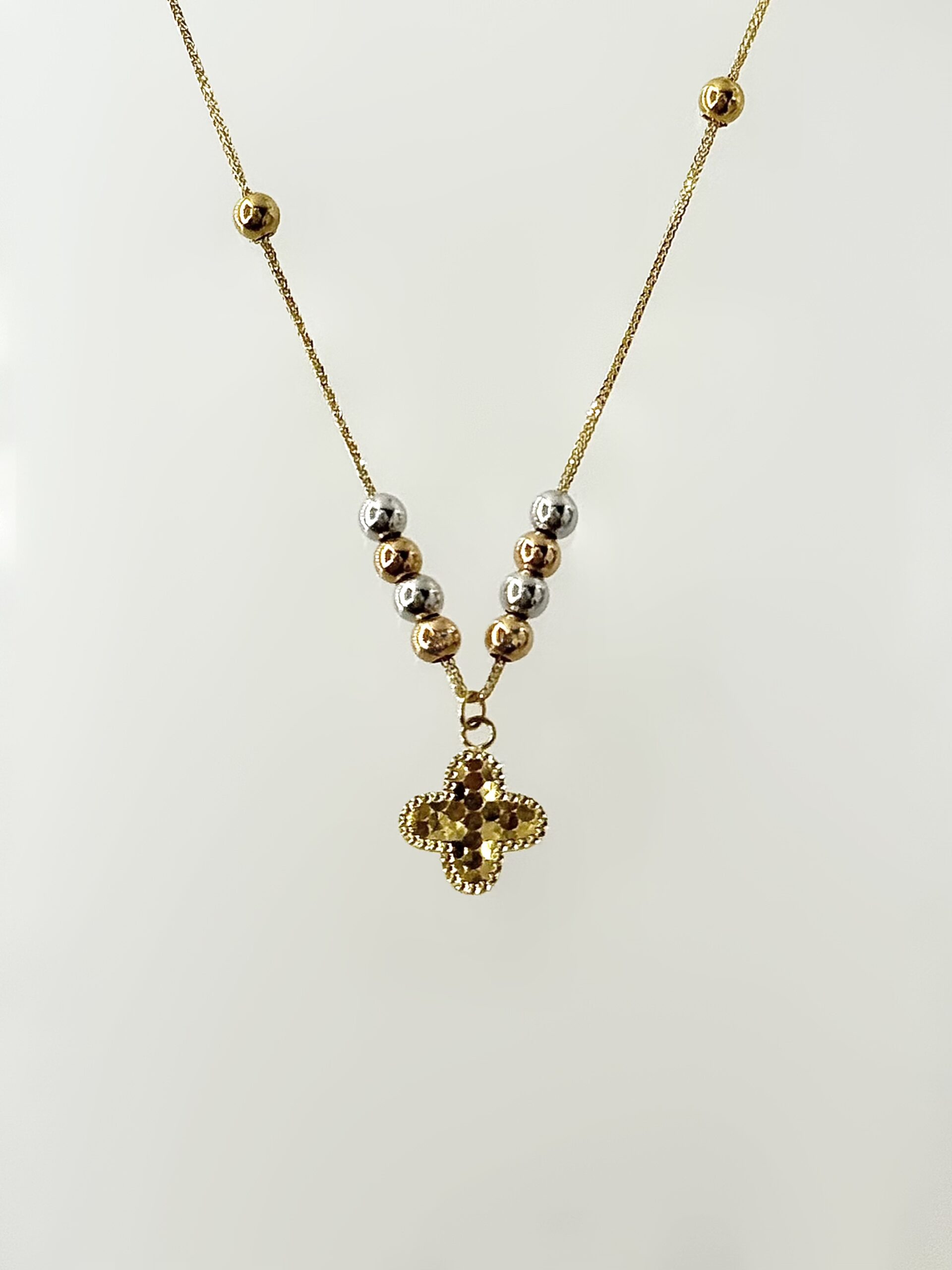 گردنبند طلای ظریف با پاندانت گل چهارپر، نماد زیبایی و طبیعت، همراه زنجیر نازک اما مقاوم و مرواریدهای درخشان، جلوهای مینیمال و لوکس برای استایل خاص شما.